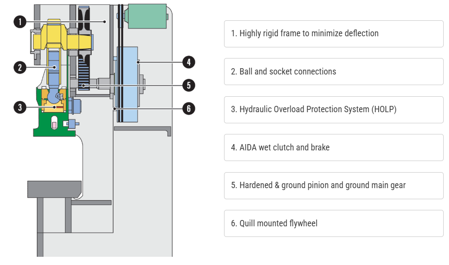 Hệ thống bảo vệ quá tải thủy lực(HOLP) của AIDA cung cấp thời gian đáp ứng nhanh nhất của ngành công nghiệp, điều chỉnh mức độ hành trình phù hợp và một công tắc "không dính" giải phóng một thanh trượt bị "kẹt"ở phía dưới đáy trong vài giây để giảm thiểu thời gian chết.